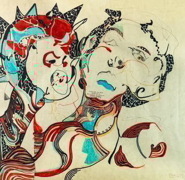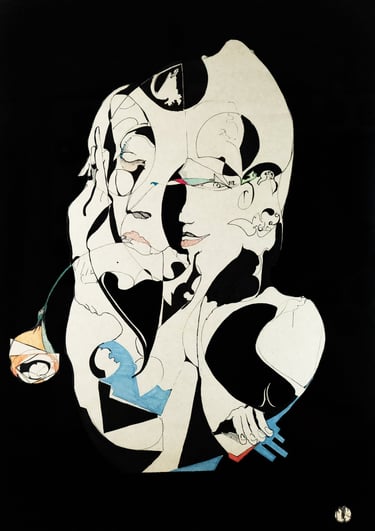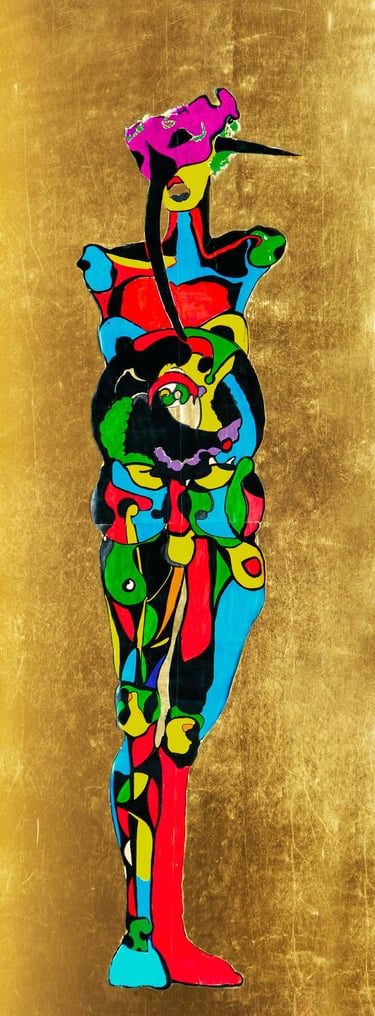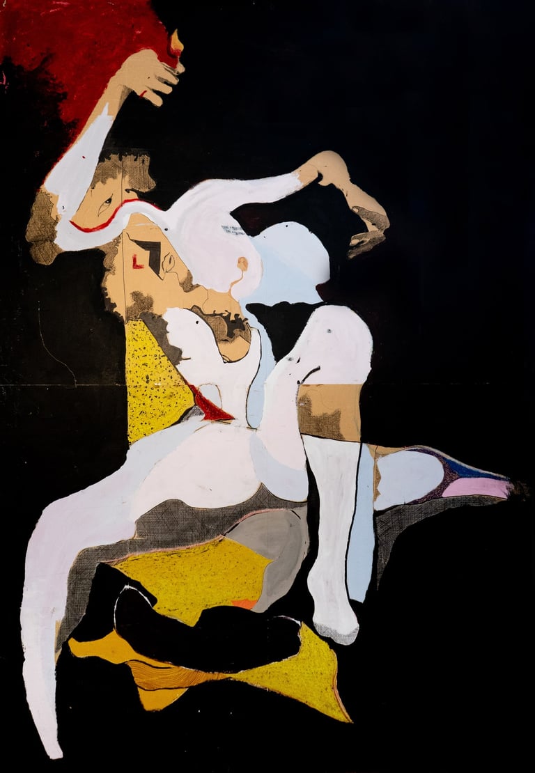Probabilmente nello sfondo nero, disciolto in minuscoli pigmenti di tempera nera. In quest’opera non ho voluto rappresentare una forma definita né un’identità riconoscibile, ma piuttosto il momento esatto in cui queste iniziano ad esistere per volontà del desiderio. È un’immagine di passaggio, un frammento di soglia. La figura antropomorfa che emerge abita la linea di separazione descritta nei testi vedici, dove dal nulla assoluto qualcosa si stacca, si individua, e sceglie di esistere. I colori lattiginosi, le texture spezzate, le superfici mutevoli sono il segno dell’inconsistenza del corpo, della sua natura fluida, delle sue molteplici possibilità di trasformazione. Questa non è la rappresentazione del mio io reale, ma del luogo stesso da cui il mio io reale prende forma.