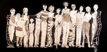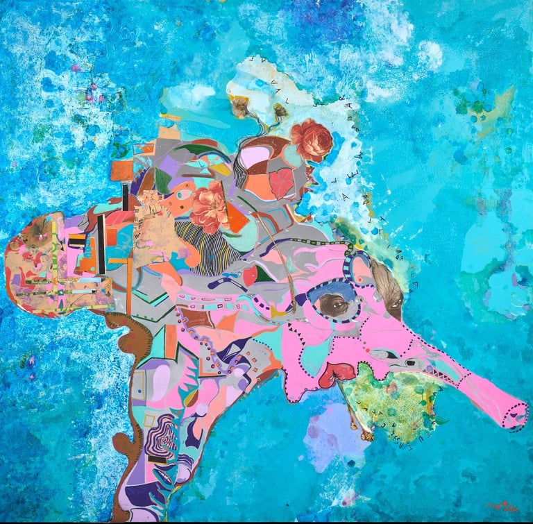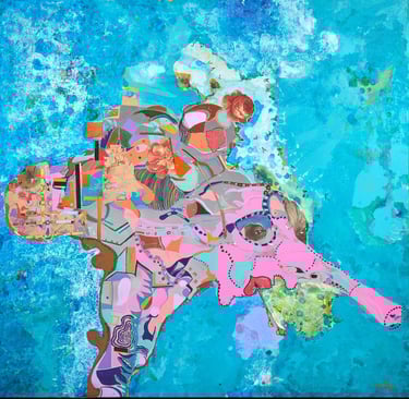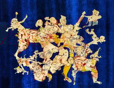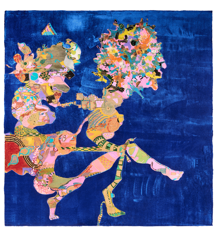 A bologna vivevo in un porto di mare, c’era sempre una gran movimento e tutto non era mai dove ti aspettavi di trovarlo. Bolo One Day è una mappa, un quadro ed un viaggio introspettivo dentro una delle più belle giornate che trascorsi a Bologna. Una sera organizzammo una grande cena e cucinammo dei gnocchi rosa alla barbabietola. E proprio da uno dei fogli sul quale appoggiamo le barbabietole nasce questo quadro. Le barbabietole lo avevano macchiato con il loro succo ed io ricamai attorno ad ognuna di esse un disegno che raccontasse un pezzo della mia giornata. L’insieme risulta quindi una complessa esplosione di colori che racconta vivacemente tutta la mia giornata. Il quadro comincia quindi in alto a sinistra con due personaggi che abbracciati passeggiano. Poi continua verso destra, a piedi scalzi, tra personaggi di strada, sguardi e donne. Donne che piene di erotismo si mostrano come la figura centrale nella parte bassa del disegno e donne che fuggono via, verso altri lidi, con altri uomini. Ci sono poi i miei pensieri più malinconici che barriscono nel mio animo rappresentati dall’elefante in basso a sinistre e da un autoritratto psichedelico che prende vita affianco ad esso. Tutto è circondato dall’azzurro elettrico del velluto, un po’ come il mare circonda la terra e un po’ come il cielo di bologna circonda i profili dei suoi palazzi, suggerendoci che bologna non è una città bensì un’isola in cui perdersi.